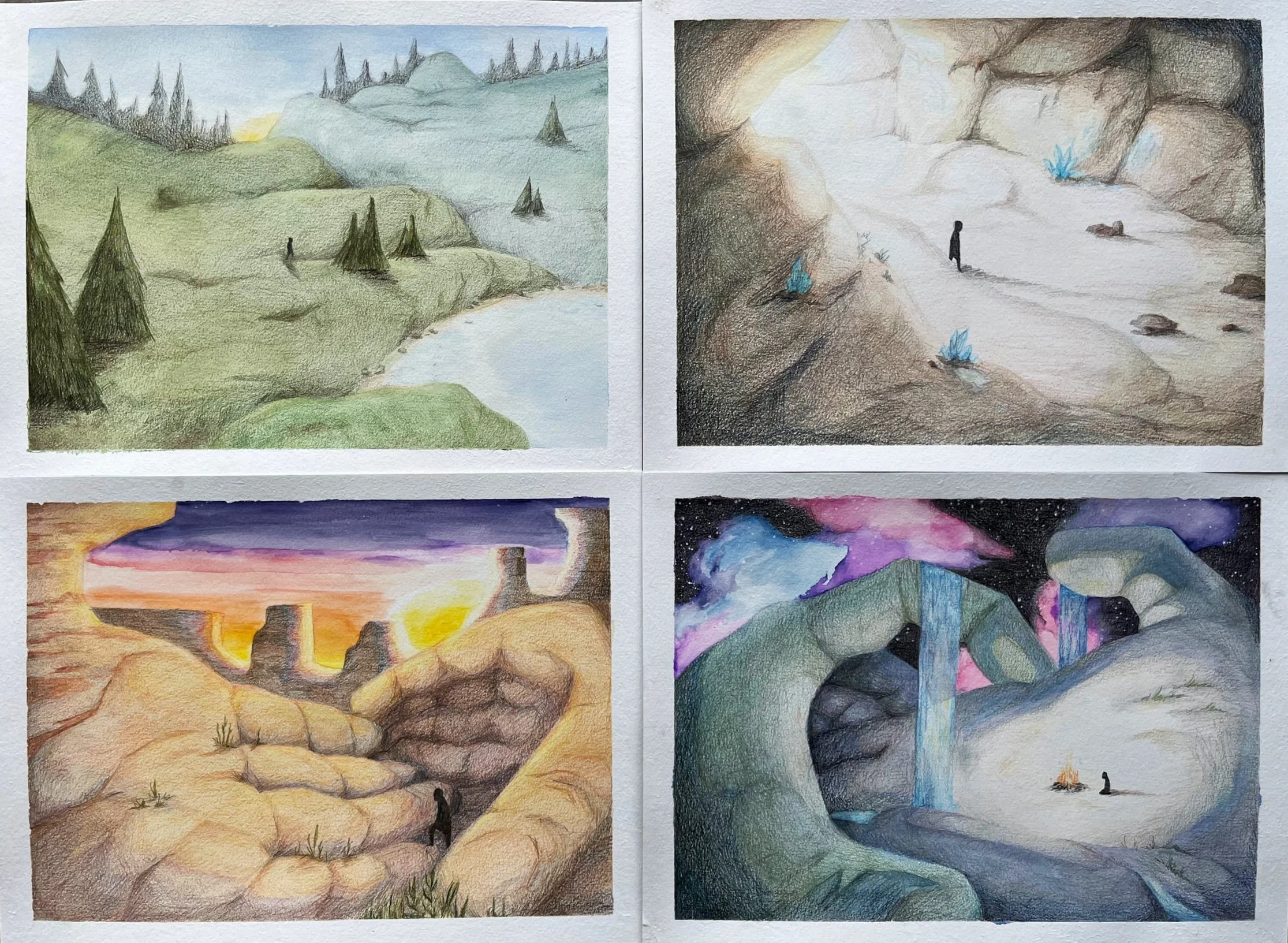 Handscapes - colored pencil and watercolor on paper - four 11x14” drawings
