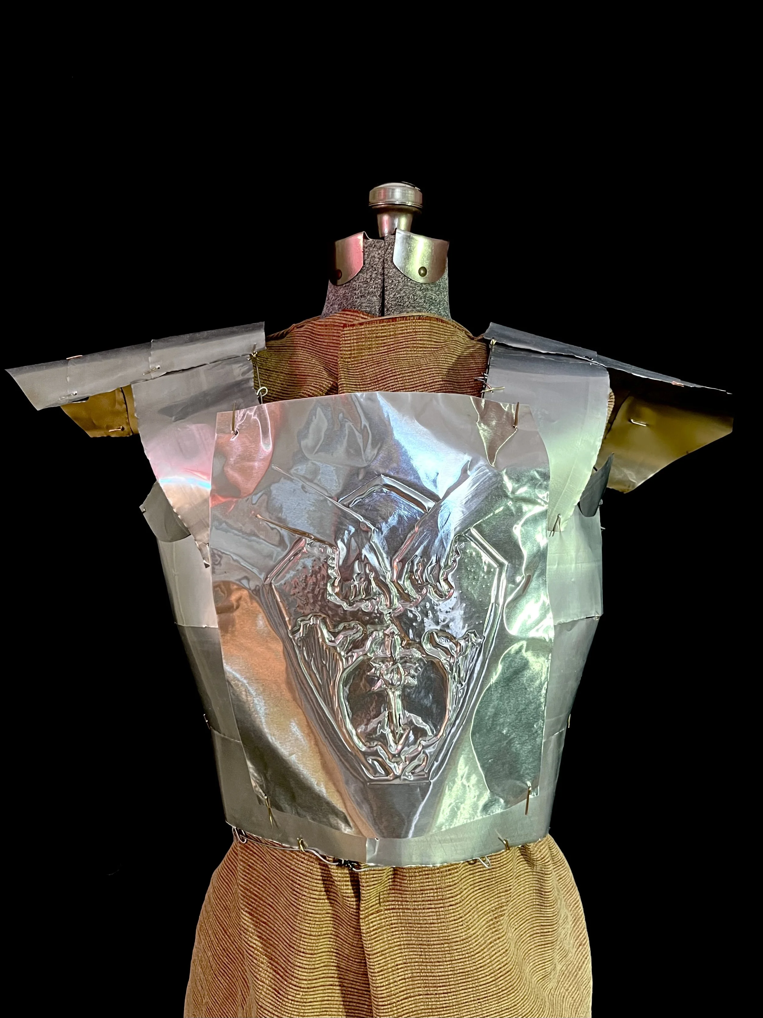 Ceremonial Armor - soda cans, copper wire, spray paint, tooled aluminum - roughly 24x28x12”